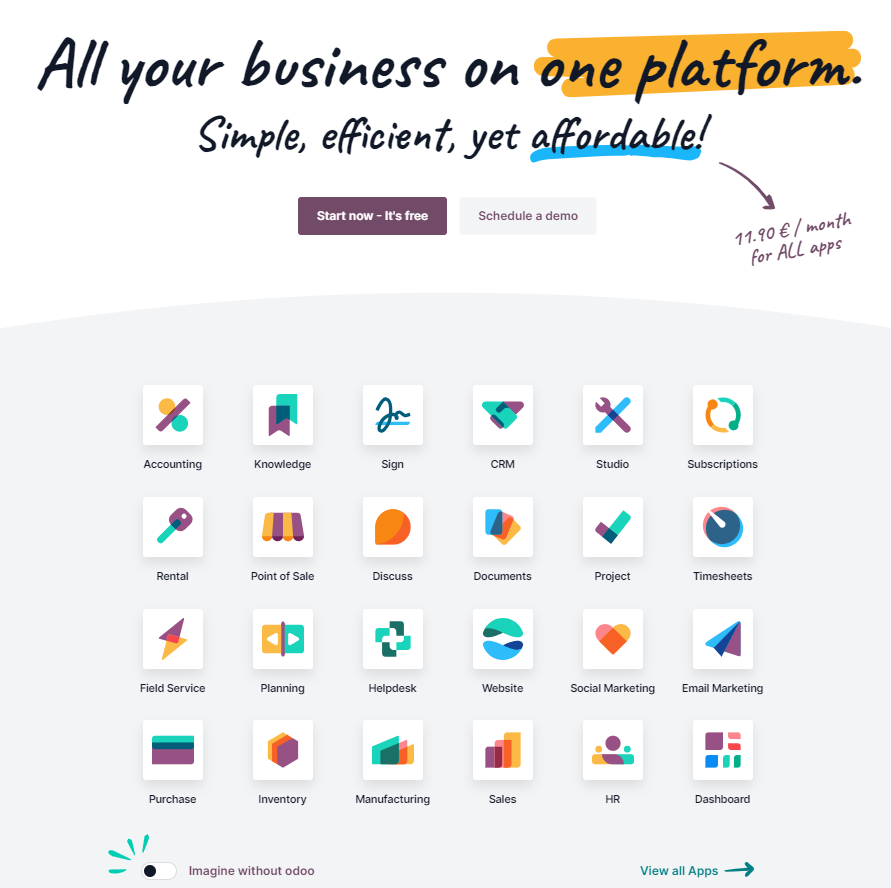Imaginați-vă impactul când toată lumea primește instrumentul potrivit pentru muncă, cu o integrare perfectă între diferite procese: Achiziții, Stocuri și Inventar, Producere și Mentenanță, CRM și Vânzări, Resurse Umane HR, Planificare și Proiectare, Gestiune Financiară și Contabilitate, dezvoltare Web-site și multe altele.